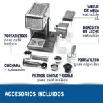 La cafetera incluye filtros de espresso sencillo y doble, filtros para sobres E.S.E. y portafiltro para cápsulas tipo Nespresso Original.