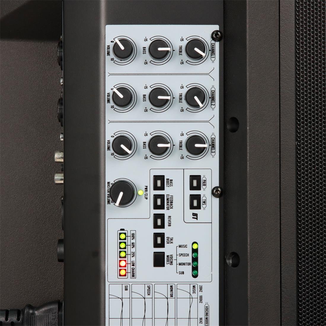 Procesador DSP con Voicing Modes: Incluye 4 configuraciones preestablecidas (presets) que adaptan la ecualización instantáneamente según el uso: ya sea para música, discursos o presentaciones en vivo.