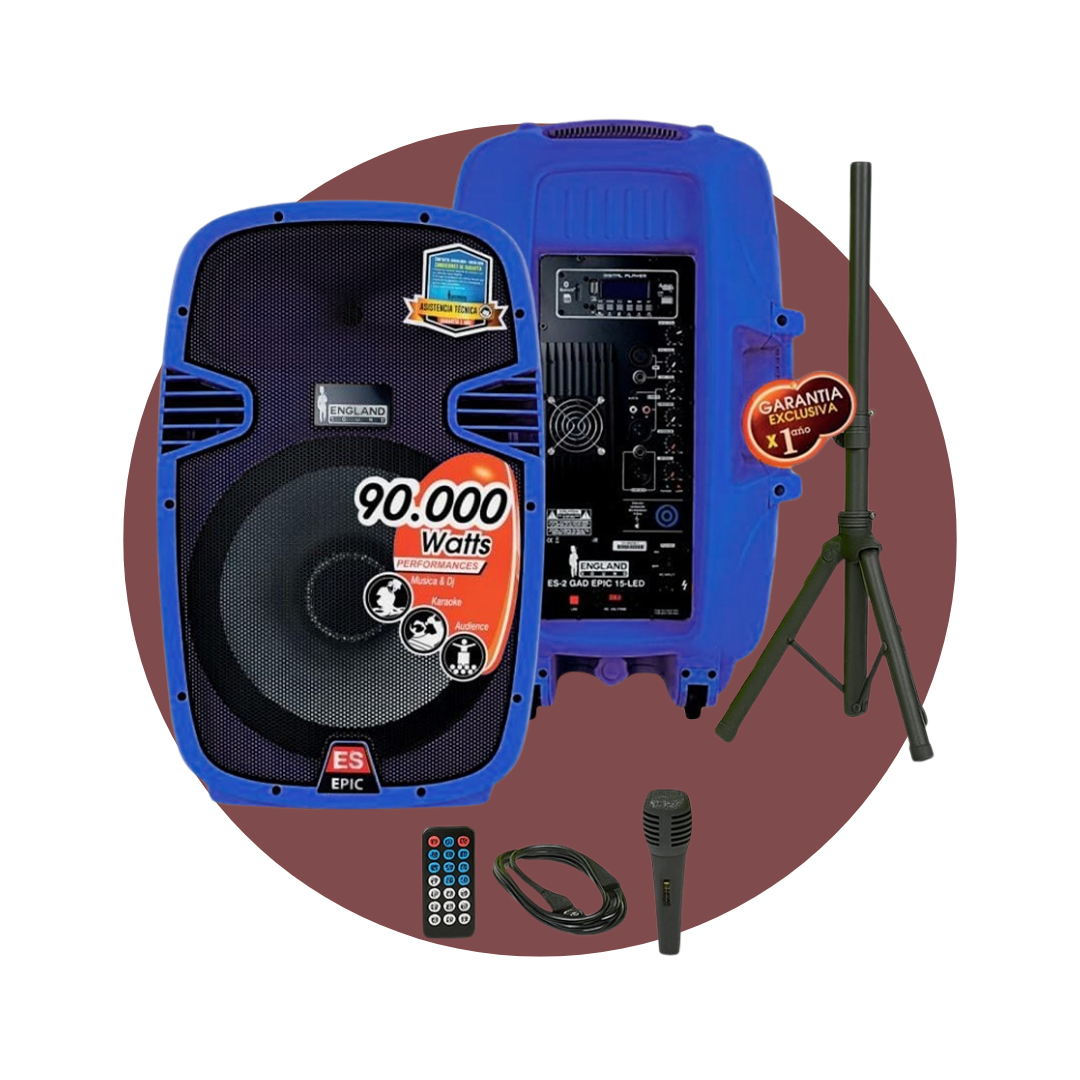 La Caja Amplificada England Sound 15″ ES-2GADEPIC-BL es un potente sistema de audio de Clase AB y 150W RMS, diseñado con Iluminación RGB y conectividad Bluetooth, ideal para eventos.