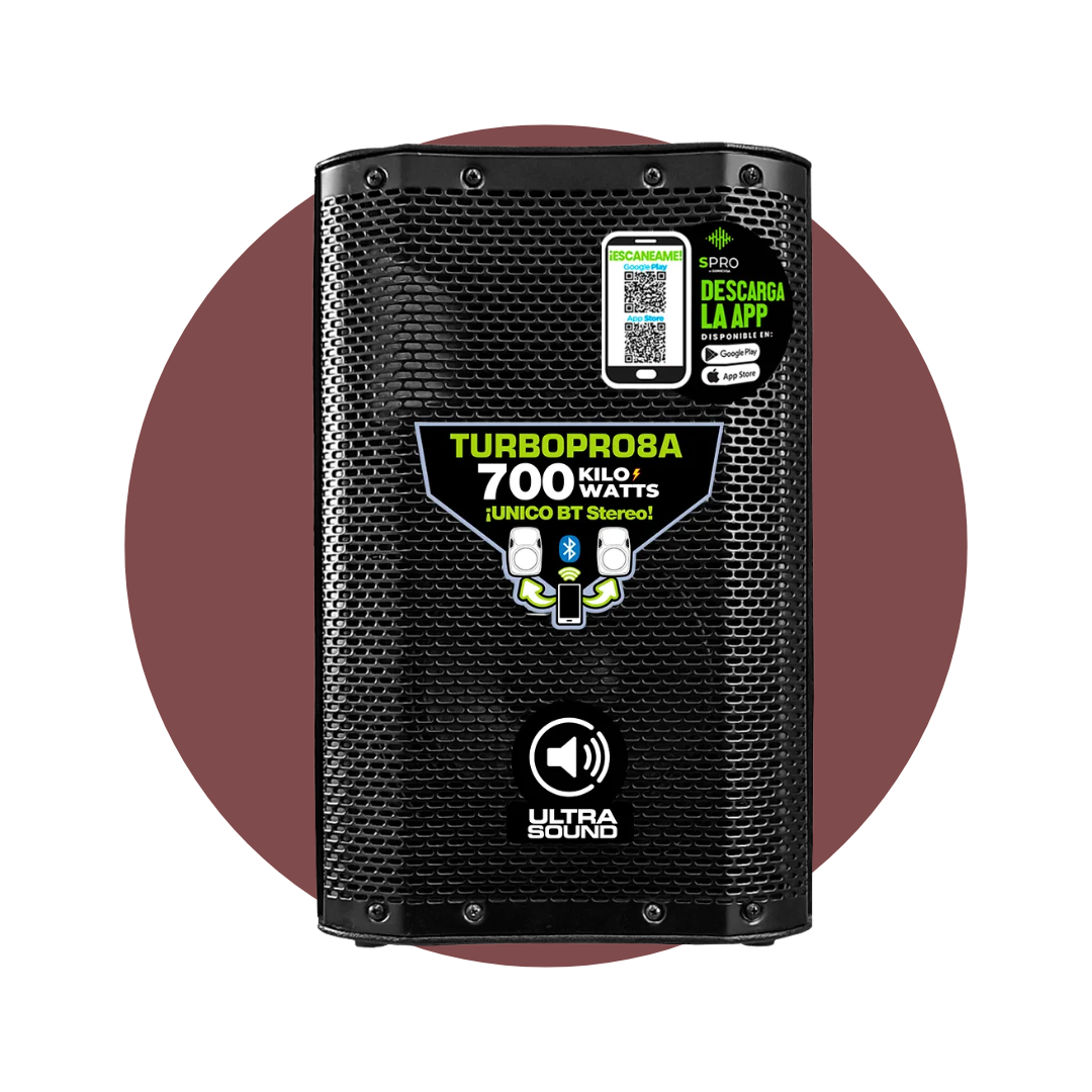 La Caja Amplificada Ultra Sound TURBOPRO8A MK3 es un altavoz activo de 8 pulgadas con una potencia máxima de 700 kilovatios. Se destaca por su tecnología BT STÉREO patentada y su control mediante APP móvil, ofreciendo conectividad moderna y múltiples opciones de entrada y salida para uso profesional.