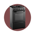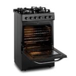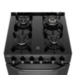 Cocina Electrolux FE4GPE de 4 quemadores con grill eléctrico (1825W), diseño elegante en color negro y mesa de vidrio templado. Incluye horno de 65L con tecnología VaporBake® (cocción al vapor 2x más eficiente) y recubrimiento FASTClean para fácil limpieza. Perfecta para cocinar con precisión gracias a sus quemadores sellados con triple flama, temporizador mecánico y puerta panorámica full glass.