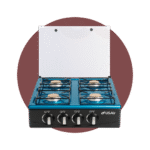 -Tapa de vidrio -4 quemadores -parrilla esmaltada -Control de perilla -Seguro de niño -Placa de acero inox.