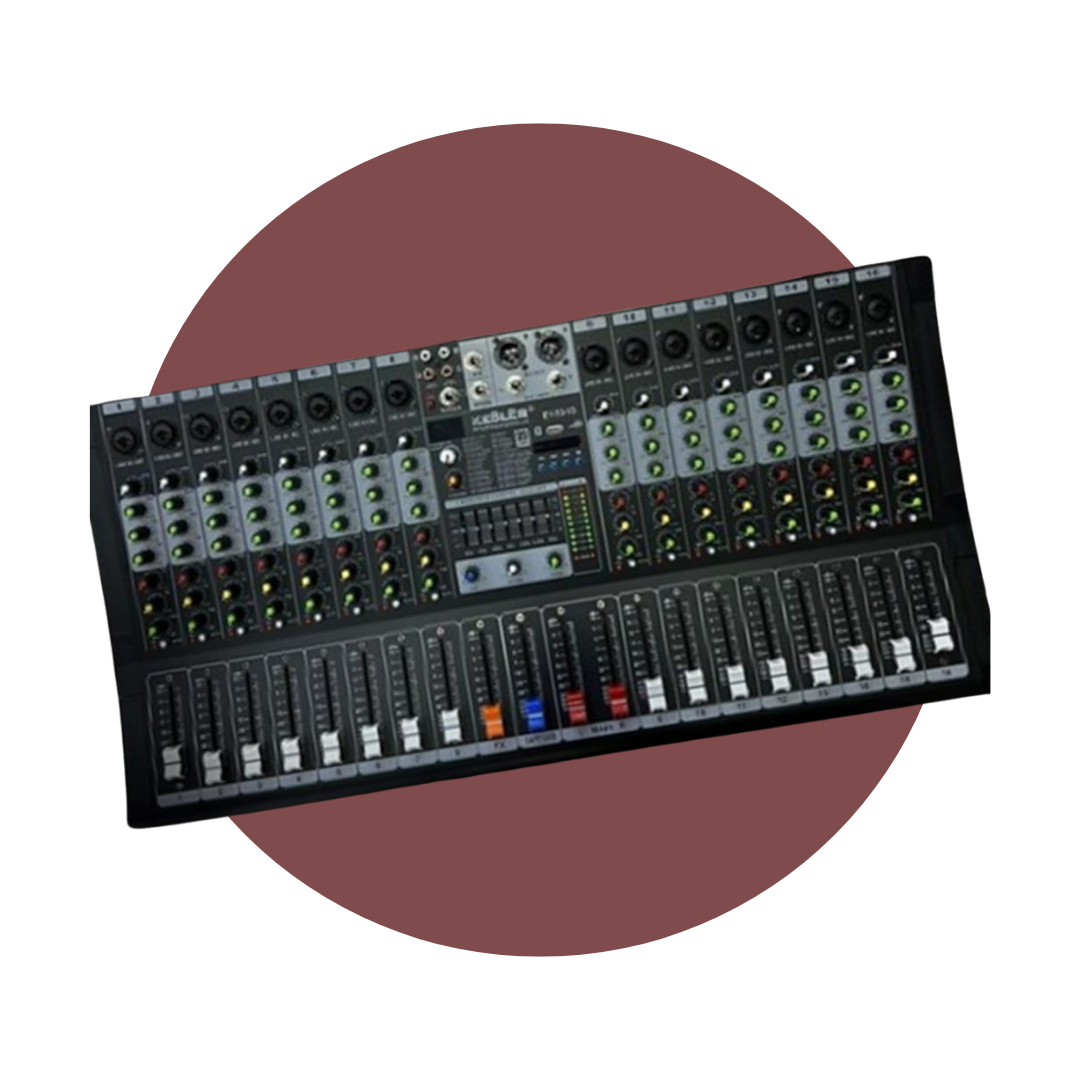 La Consola Kebler E15019 es una mesa de mezclas profesional de 16 canales mono, diseñada para sonido en vivo, grabaciones en estudio o aplicaciones de DJ. Cuenta con ecualizador de 3 bandas por canal, ecualizador gráfico estéreo de 7 bandas, 99 efectos digitales y alimentación fantasma +48V para micrófonos de condensador. Integra reproductor MP3 con Bluetooth, función de grabación y fuente de alimentación conmutada (100-240V), ofreciendo un control completo y versatilidad para eventos medianos y configuraciones fijas.