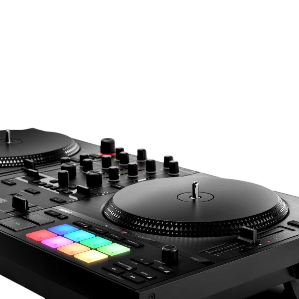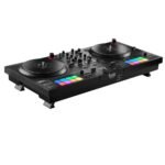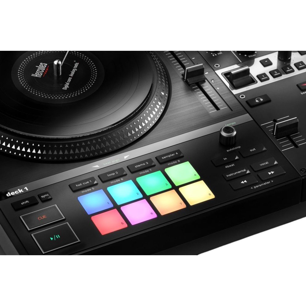 - Pads RGB: Ocho pads por deck que facilitan la activación de Hot Cue, Loop y Sample, optimizando el flujo de trabajo del DJ.