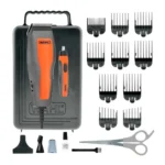 El combo Wahl 09314-2608 ofrece una solución completa para el cuidado del cabello en casa. Incluye una cortadora con cuchillas autoafilables y 10 peines guía, además de una recortadora con dos cabezales intercambiables para detalles precisos.