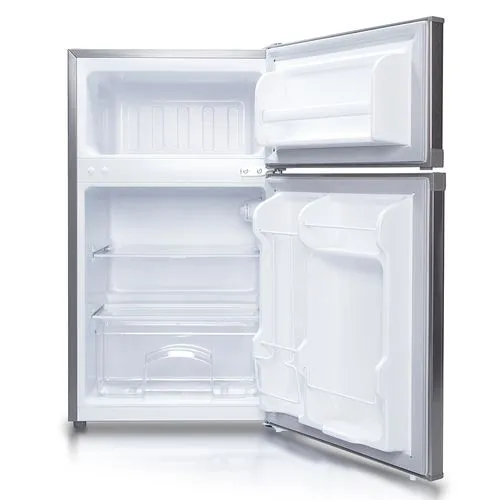 Minibar compacto de 85 litros con diseño de dos puertas, clasificación energética Clase A y sistema de deshielo Frost, ideal para una organización eficiente en acabados Gris Silver.