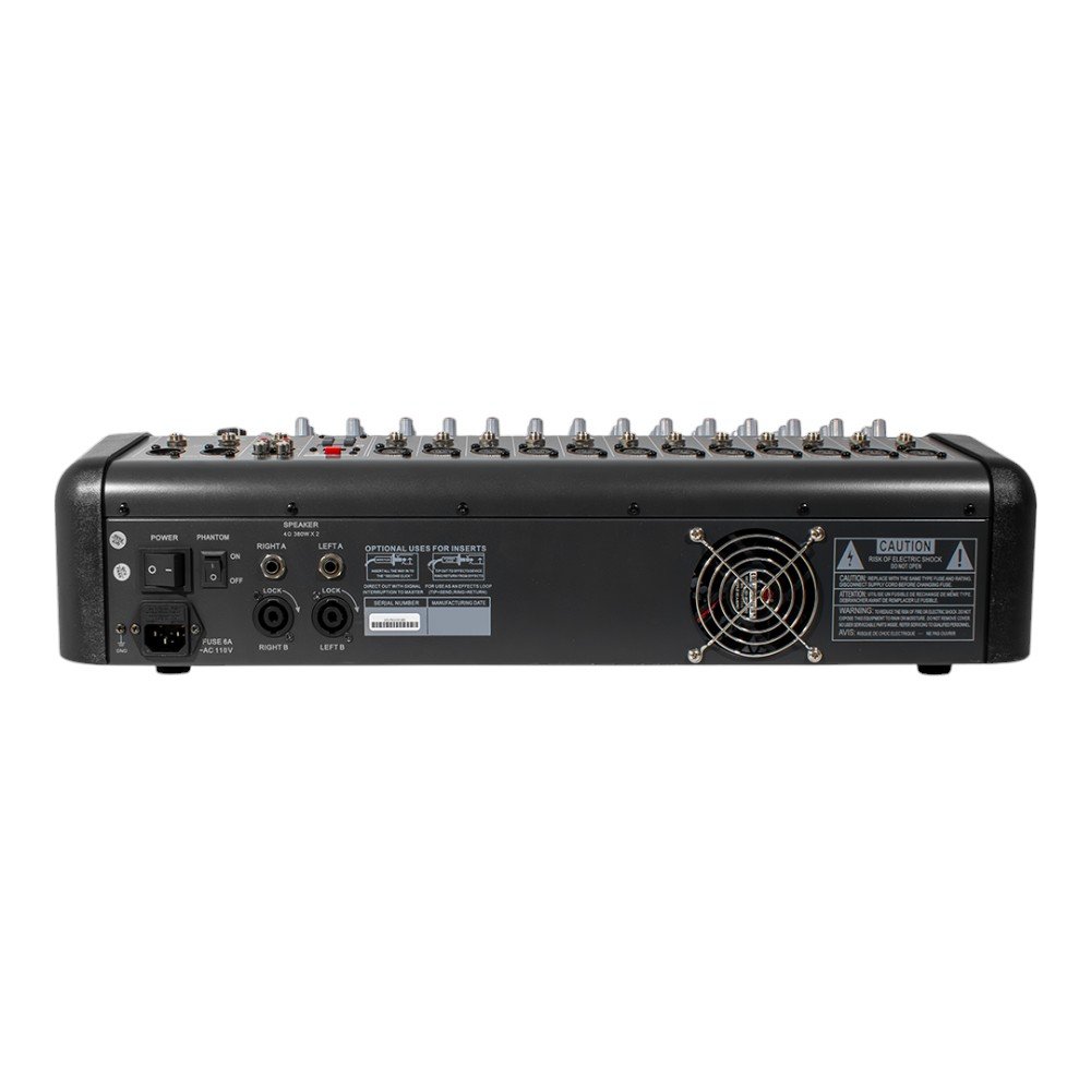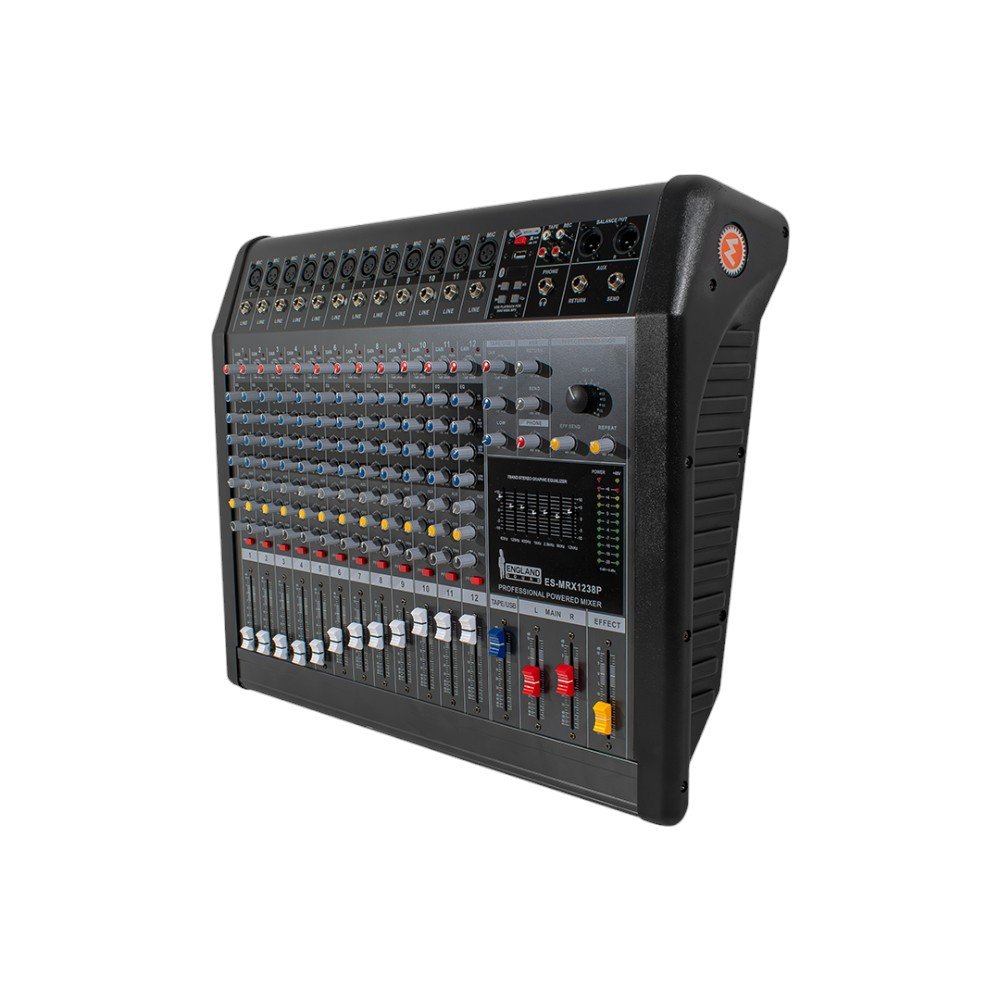 El Mixer Profesional 12 canales 382W ENGLAND SOUND ES-MRX1238P es una consola amplificada de alto rendimiento diseñada para ofrecer máxima versatilidad y calidad en todo tipo de eventos. Con una potente salida de 760W (2x380W), este equipo proporciona un sonido limpio y potente que se adapta a cualquier situación, desde conciertos hasta conferencias. Con 12 canales de mezcla, ofrece múltiples opciones para conectar micrófonos y dispositivos de audio.