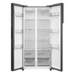 Este refrigerador MIDEA Side By Side de 442 litros ofrece una gran capacidad de almacenamiento y características convenientes como No Frost, panel digital exterior, doble cajón para frutas y verduras, y alarma en la puerta.