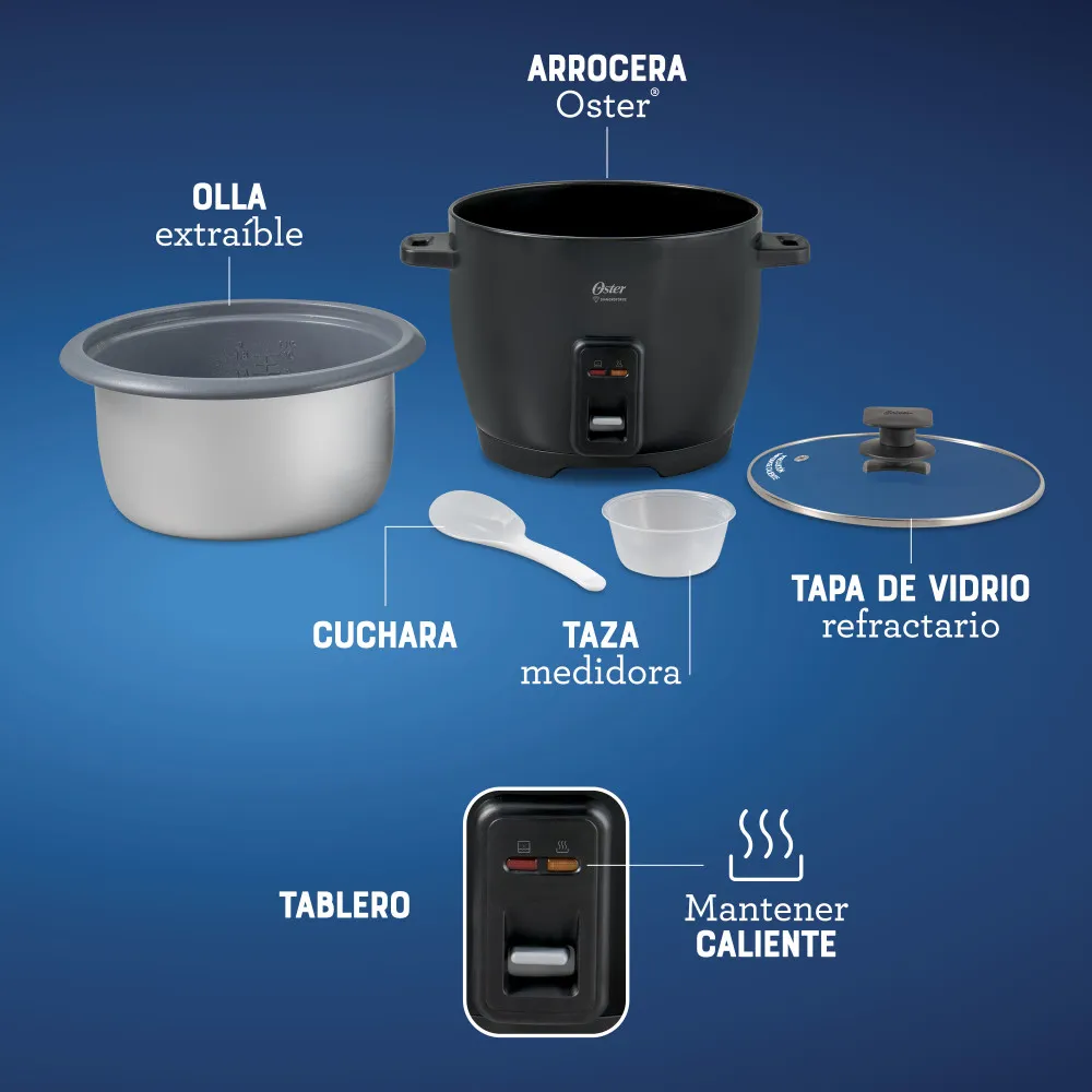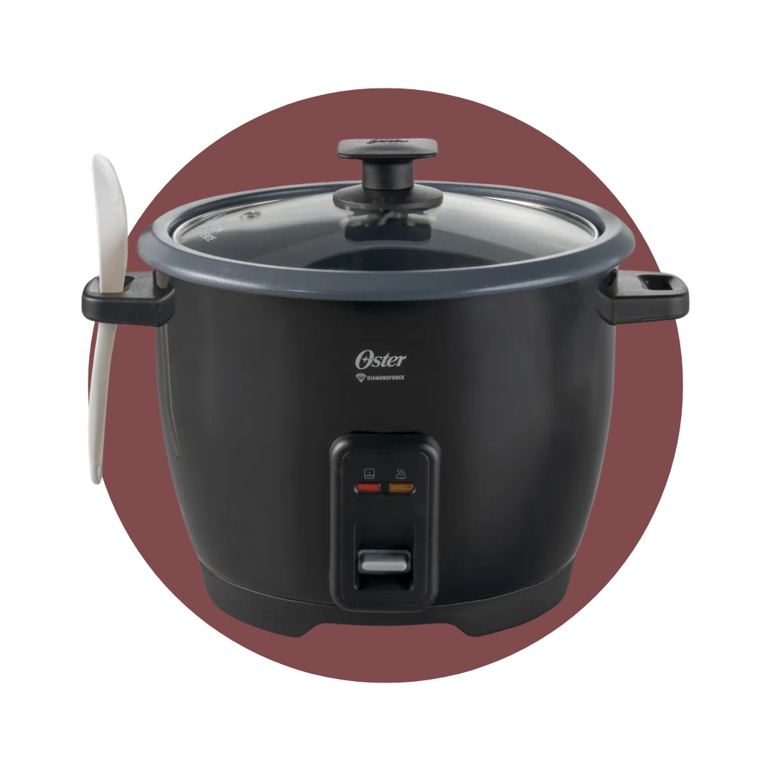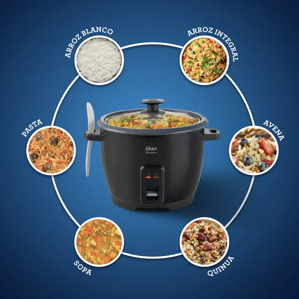 La Arrocera Oster es ideal para disfrutar de una gran variedad de platos en familia. No solo puedes preparar arroz, sino también quinoa, avena, sopas y mucho más, para sorprender a todos con recetas deliciosas y fáciles en un solo electrodoméstico. Su recubrimiento antiadherente Oster DiamondForce es 15 veces más fácil de limpiar* y no se daña ni se desgasta con el uso**, garantizando que te acompañe por mucho tiempo. Además, la función automática Mantener Caliente asegura que tus comidas estén en su punto perfecto hasta el momento de servirlas. Las asas están diseñadas para sostener la tapa y la cuchara cómodamente, sin complicaciones. Incluye una taza medidora y una cuchara para medir y preparar todas tus recetas.