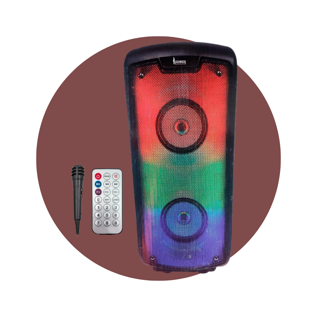 – Parlante de 2X4″ – Poder RMS: 16W – Impedancia: 3 Ohm – Aux – Entrada de microfono – Bateria recargable – TWS – Control remoto – Microfono de cable