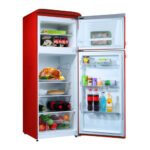 Esta refrigeradora de estilo retro combina la estética vintage con funcionalidades modernas. Cuenta con un congelador independiente para una mejor conservación de los alimentos, iluminación interior y charolas de cristal para una fácil organización. Su control de temperatura mecánico y descongelamiento manual permiten un manejo sencillo.