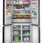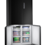 Refrigeradora Cross Door de 586 litros con diseño moderno en color negro y acabado en lámina inoxidable. Equipada con iluminación LED, dispositivo de esterilización para control de olores y panel digital multifunción. Cuenta con funciones avanzadas como zona convertible de temperatura, modo Eco, vacaciones y congelamiento rápido. Ideal para hogares que buscan eficiencia energética, organización avanzada y un diseño elegante.