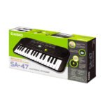 CASIO SA-47AH2-ADAP; teclado para niños y amateurs de 32 TECLAS DE TAMAÑO MINI, Empuñadura incorporada para un fácil transporte , Empuñadura incorporada para un fácil transporte. Al golpear un pulsador de sonido se produce el sonido de batería correspondiente. Incluye 2 sonidos de percusión para música de la India.