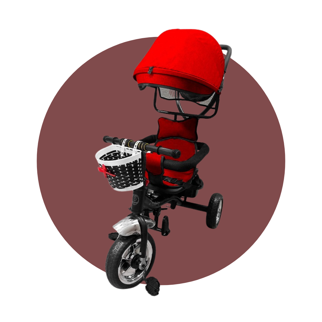 -Guiador -Toldo -Reposa pies -Triciclo -Canasta COLORES: GRIS, ROJO, AZUL