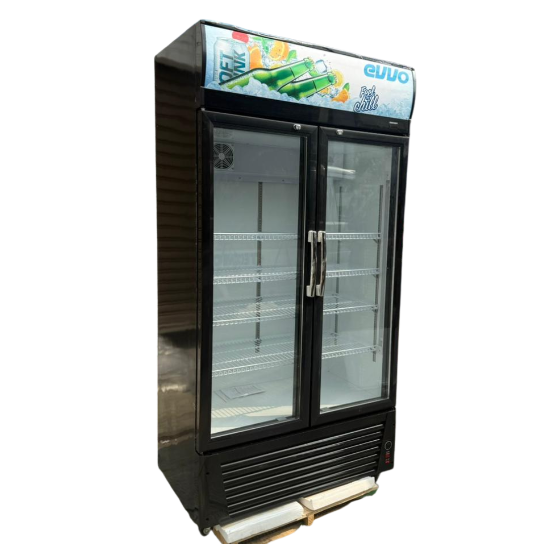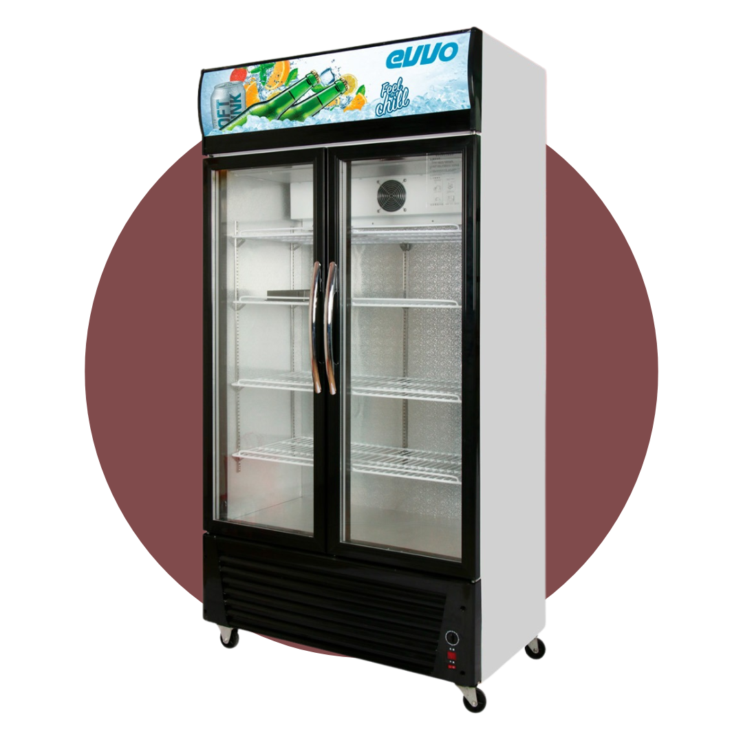 La VITRINA EVVO LSC-728 DOBLE PUERTA es un exhibidor comercial de gran formato con 728 litros de capacidad, control de temperatura digital y un eficiente sistema de enfriamiento ventilado con doble ventilador para visibilidad óptima.