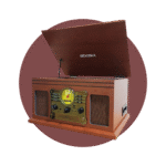 Combina el encanto vintage con características modernas, incluyendo reproducción y grabación de vinilos a MP3, reproductor de CD y cassette, radio AM/FM, Bluetooth, entrada auxiliar y conector de auriculares
